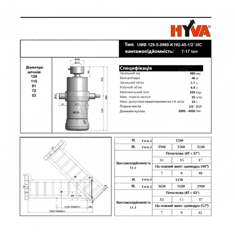 Гидроцилиндр Hyva UMB 129-5-0980-K192-45-1⁄2“-HC