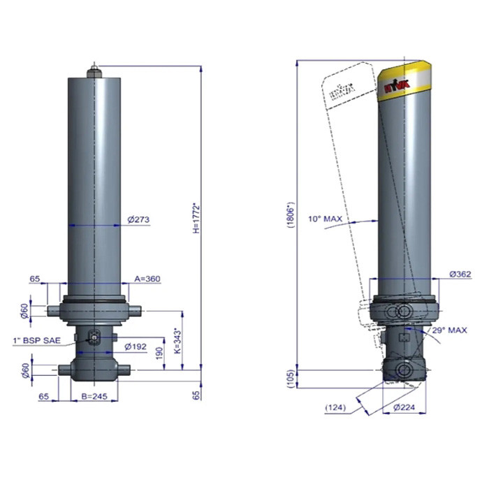 Гидравлический цилиндр диаметром 169 мм и 5 штоками способен поднимать до 56 тонн, достигая общего хода 7050 мм. Имея максимальное рабочее давление 250 бар, этот гидроцилиндр от Hyva способен поднимать большие нагрузки, что, в свою очередь, позволяет грузовикам быть оснащены более компактными гидроцилиндрами, экономя место и вес. Цилиндр подъема кузова FC A169-5-07050-000-K0343-HD-HC серии Alpha в основном используется в сочетании с прямым соединением корпуса и цапфовым типом соединения.